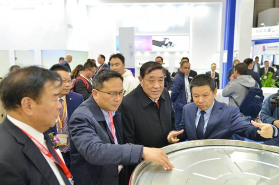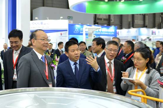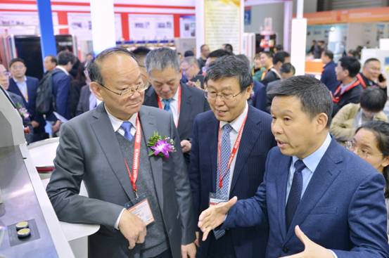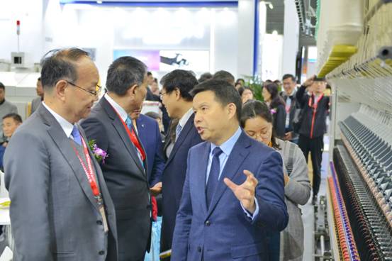 中國紡織工業(yè)聯(lián)合會(huì)黨委書記、秘書長高勇(左1)聽取董事長沈方勇介紹參展情況