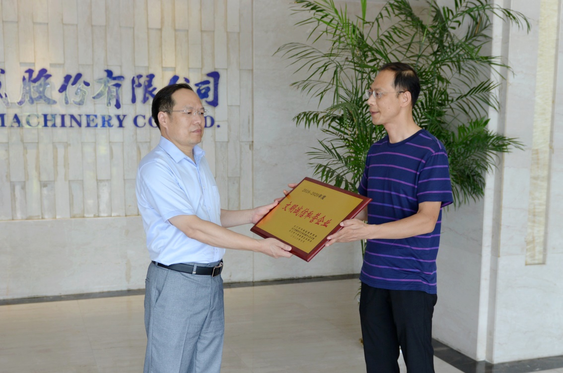 8月18日,天門市市場監(jiān)督管理局對天門紡機(jī)獲得的"文明誠信私營企業(yè) "榮譽(yù)進(jìn)行現(xiàn)場授牌,黨委書記魯?shù)挛拇砉窘优?。