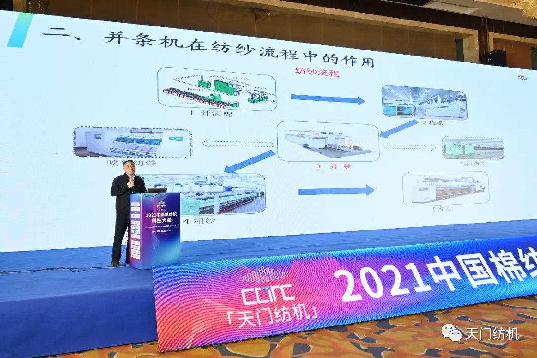 湖北天門紡織機(jī)械股份有限公司總經(jīng)理焦倫進(jìn)作了《并條機(jī)的創(chuàng)新與未來》的專題報(bào)告。在報(bào)告中,焦倫進(jìn)總經(jīng)理介紹了并條機(jī)在紡紗流程中的作用,并就目前紡織企業(yè)對(duì)并條機(jī)創(chuàng)新的要求,從傳動(dòng)結(jié)構(gòu)及精度、加壓系統(tǒng)、牽伸裝置、清潔系統(tǒng)、部件及提供設(shè)備的數(shù)字化、信息化、智能化水平等方面進(jìn)行介紹。最后,焦倫進(jìn)總經(jīng)理指出未來并條機(jī)將向著梳并聯(lián)合、并粗聯(lián)、短流程一體機(jī)在技術(shù)上的突破方向發(fā)展。