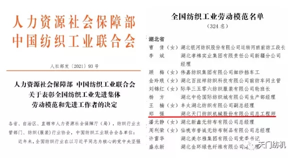為表彰獎勵一批為國家紡織工業(yè)做出突出貢獻的先進集體和個人,近日,人力資源社會保障部、中國紡織工業(yè)聯(lián)合會決定(人社部發(fā)【2021】93號文),表彰全國紡織工業(yè)先進集體、勞動模范和先進工作者,天門紡機總工程師鄭強被授予“全國紡織工業(yè)勞動模范”榮譽稱號。
