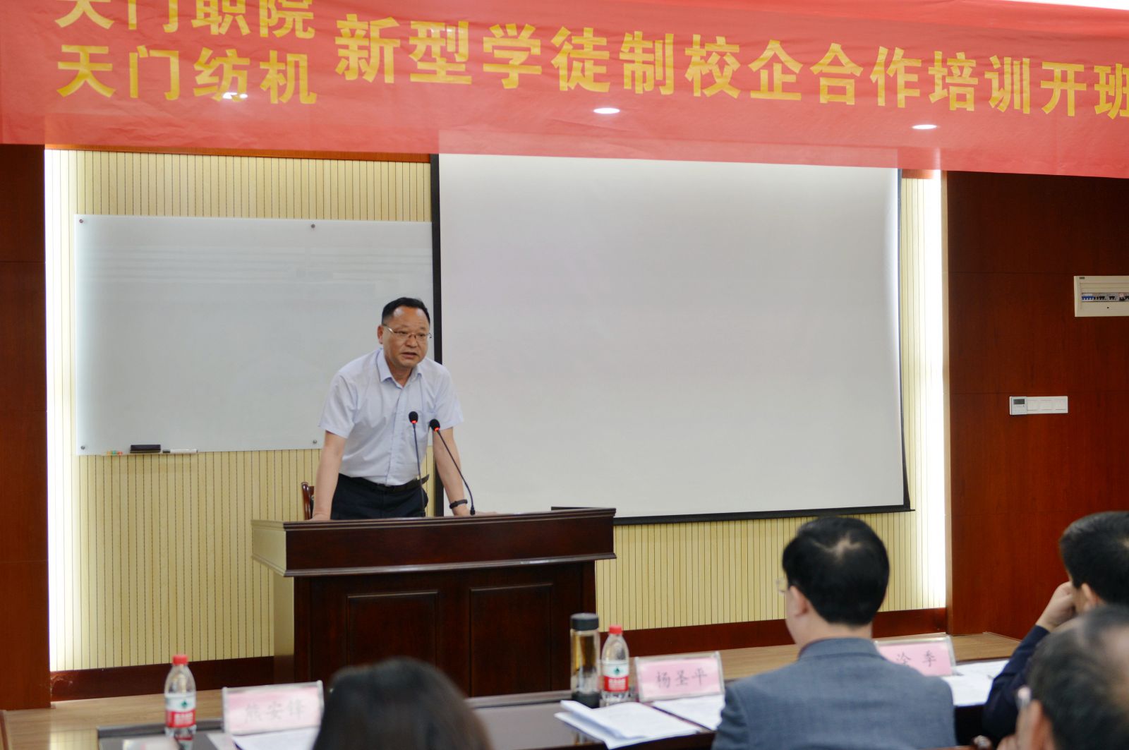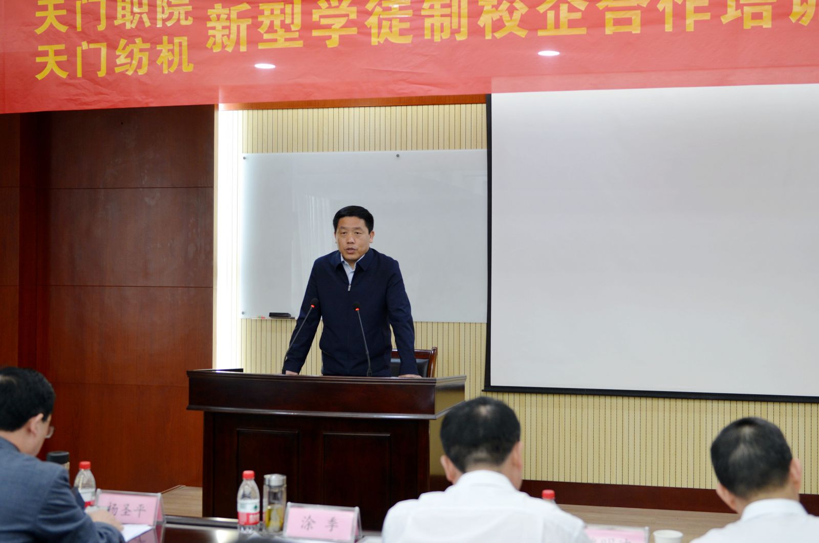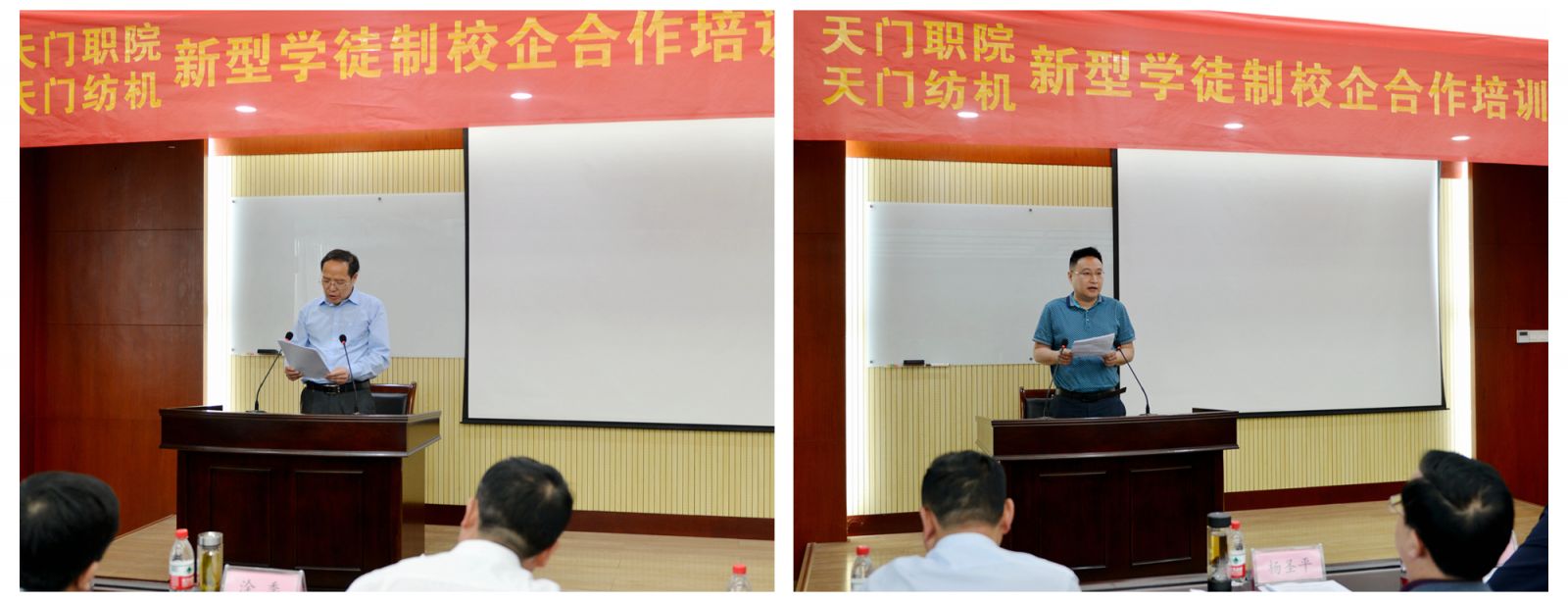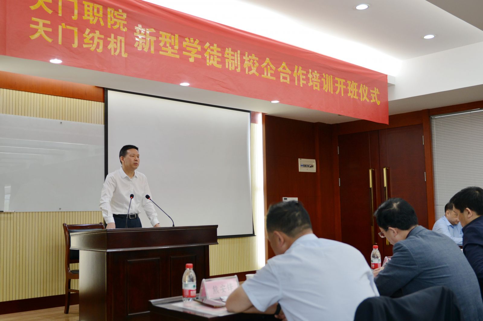 天門紡機黨委書記魯?shù)挛慕榻B了《天門職院與天門紡機新型學徒制培訓方案》,天門職業(yè)學院教師何漢兵作了發(fā)言,他代表全體培訓教師表態(tài),一定不負期望,精心備課,靈活施教,圓滿完成教學任務。
