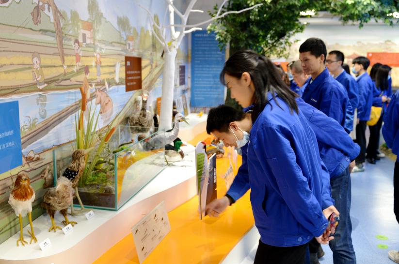 在公園管理員的導引下,我們拾級而上,參觀了科普館。這座科普館是以張家湖歷史、水文、生態(tài)為脈絡,傾心打造的集生動、趣味于一體的現代視聽平臺,還原了農耕時代人類休養(yǎng)生息的原貌和花鳥魚蟲百態(tài)。走在曲曲折折的參觀回廊上,感覺耳朵不夠使,眼睛也不夠用,太多的信息總是撲面而來。同事們都在感嘆:真是不虛此行,既休閑、愉悅了身心,又學到了知識,收獲滿滿。