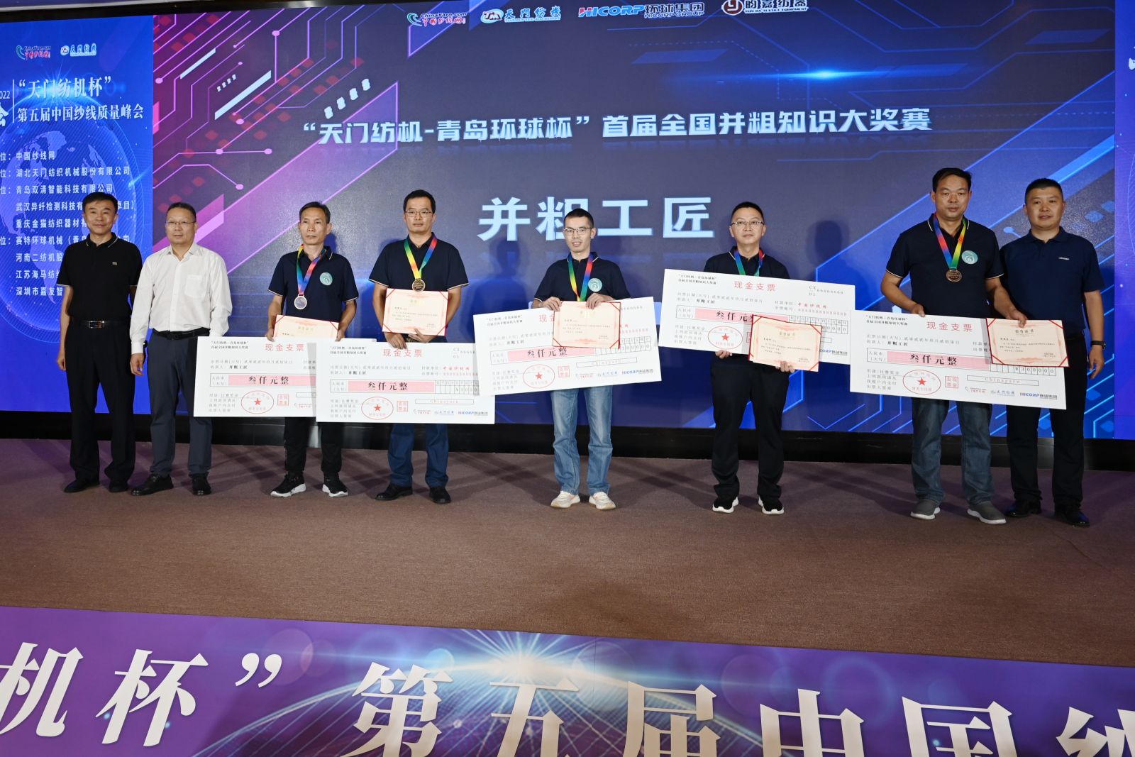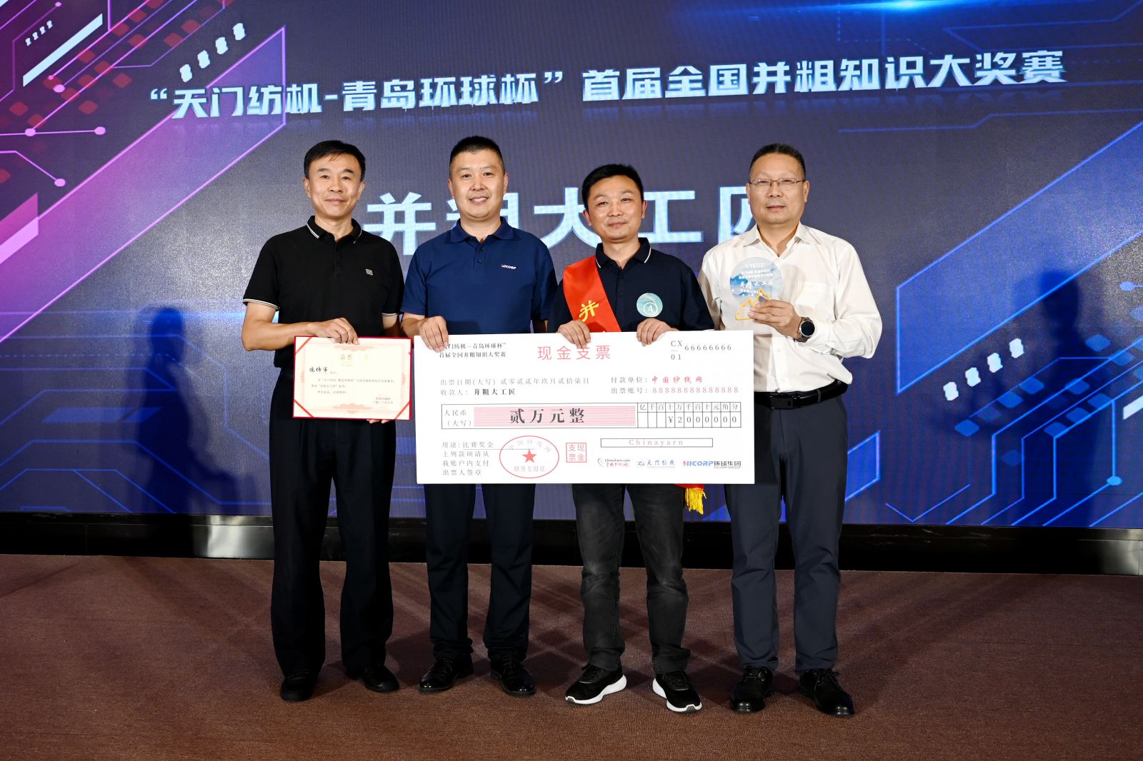 這是一場(chǎng)別開(kāi)生面的競(jìng)賽學(xué)習(xí)活動(dòng),6位選手的精彩表現(xiàn)不斷地贏得熱烈的掌聲,江蘇悅達(dá)馮傳軍以888分獲得“天門(mén)紡機(jī)-青島環(huán)球杯”首屆全國(guó)并粗知識(shí)大獎(jiǎng)賽-爭(zhēng)霸賽冠軍,為歷時(shí)3個(gè)月的大賽活動(dòng)劃上圓滿的句號(hào)?,F(xiàn)場(chǎng)爭(zhēng)霸賽結(jié)束后,隆重舉行了頒獎(jiǎng)活動(dòng),現(xiàn)場(chǎng)頒發(fā)“企業(yè)優(yōu)秀組織獎(jiǎng)”、“并粗工匠獎(jiǎng)”、“并粗大工匠獎(jiǎng)”。天門(mén)紡機(jī)副總經(jīng)理肖少華、賽特環(huán)球營(yíng)銷(xiāo)總監(jiān)陳濤、中國(guó)紗線網(wǎng)總裁鞠彥軍為大賽活動(dòng)致辭并頒獎(jiǎng)。