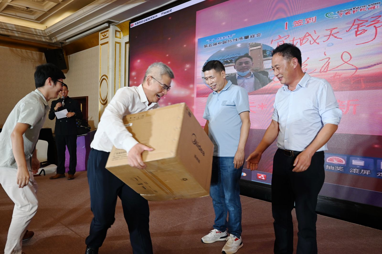 △天門(mén)紡機(jī)市場(chǎng)總監(jiān)周志宏、天門(mén)紡機(jī)副總經(jīng)理肖少華為抽獎(jiǎng)環(huán)節(jié)獲獎(jiǎng)代表頒獎(jiǎng)