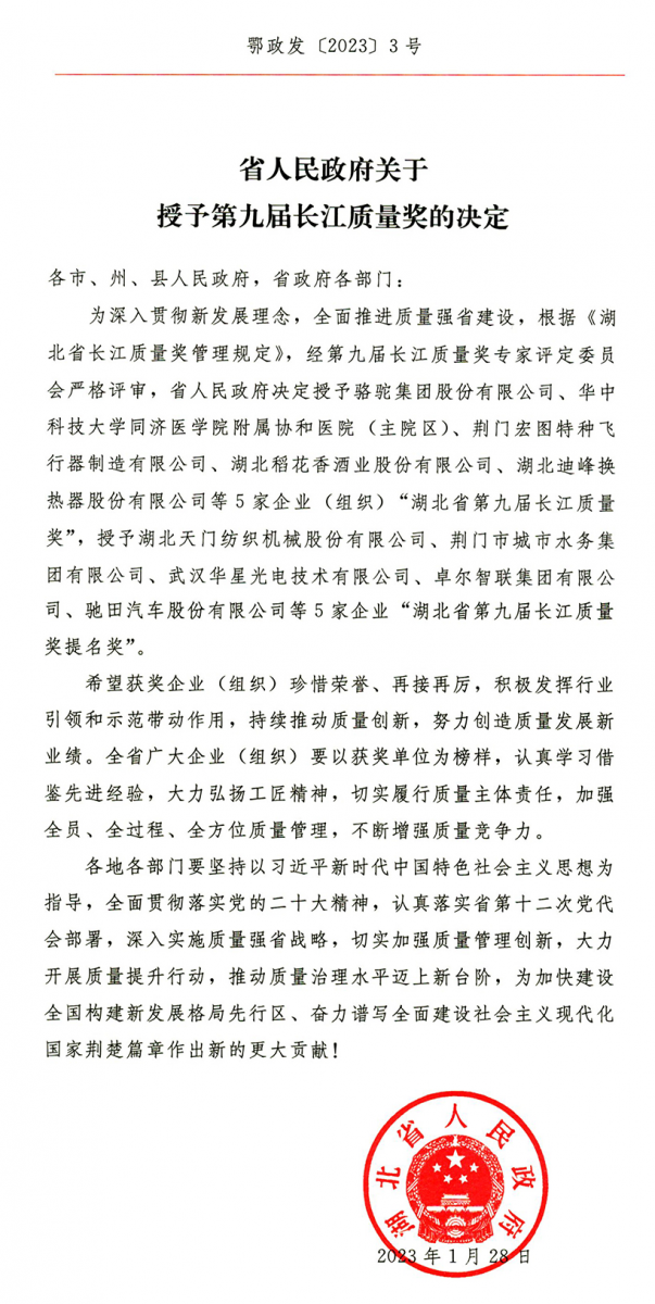 近日,湖北省人民政府以鄂政發(fā)(2023)3號文頒發(fā)《關(guān)于授予第九屆長江質(zhì)量獎(jiǎng)的決定》。天門紡機(jī)榮獲“湖北省第九屆長江質(zhì)量獎(jiǎng)提名獎(jiǎng)”,受到省政府表彰。