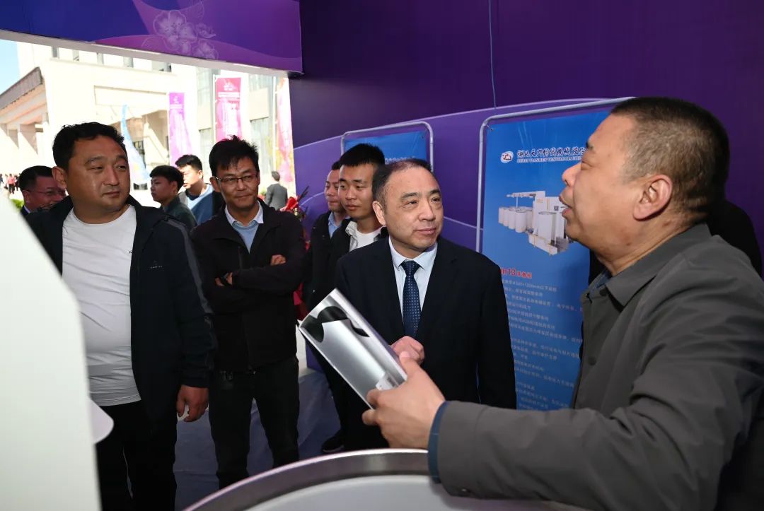 天門紡機(jī)總經(jīng)理焦倫進(jìn)向蒞臨公司展位的晉州市長(zhǎng)王林(右2)、中國服裝協(xié)會(huì)常務(wù)副會(huì)長(zhǎng)楊金純(右1)、晉州市紡織服裝行業(yè)協(xié)會(huì)會(huì)長(zhǎng)李永強(qiáng)(左1)介紹公司與晉州紡織企業(yè)合作情況