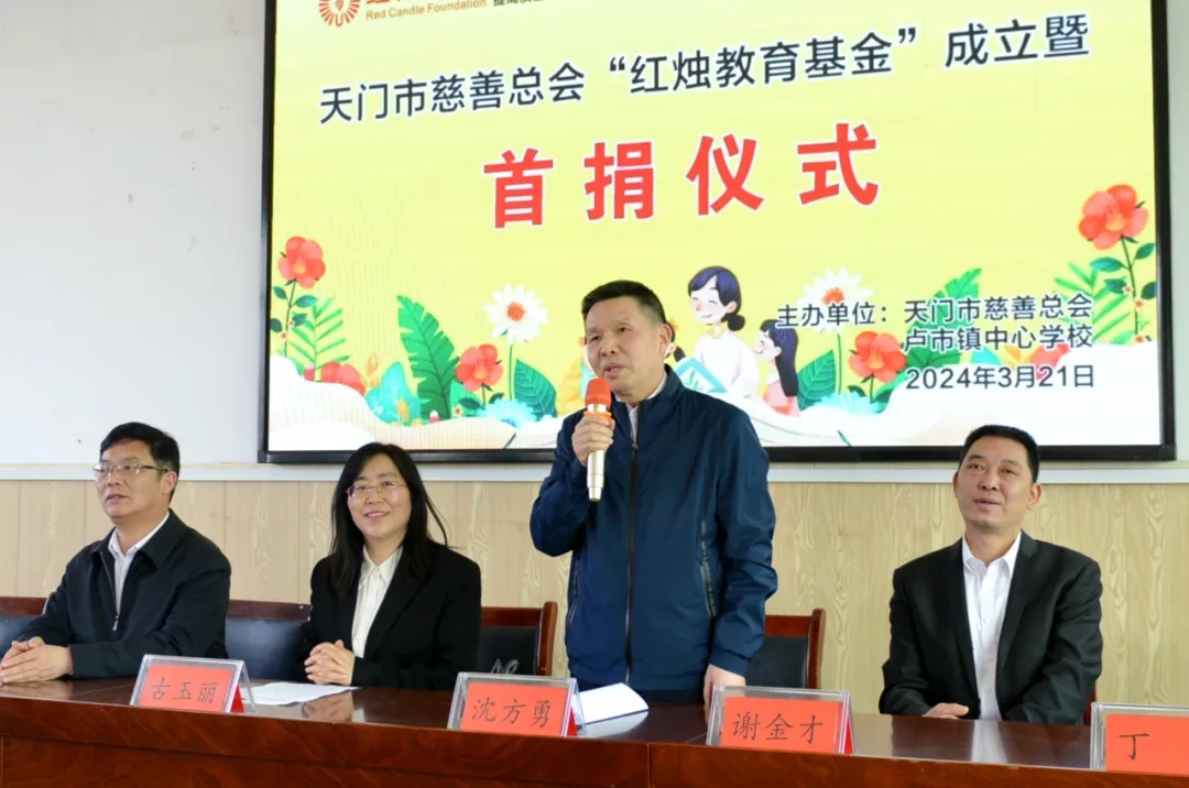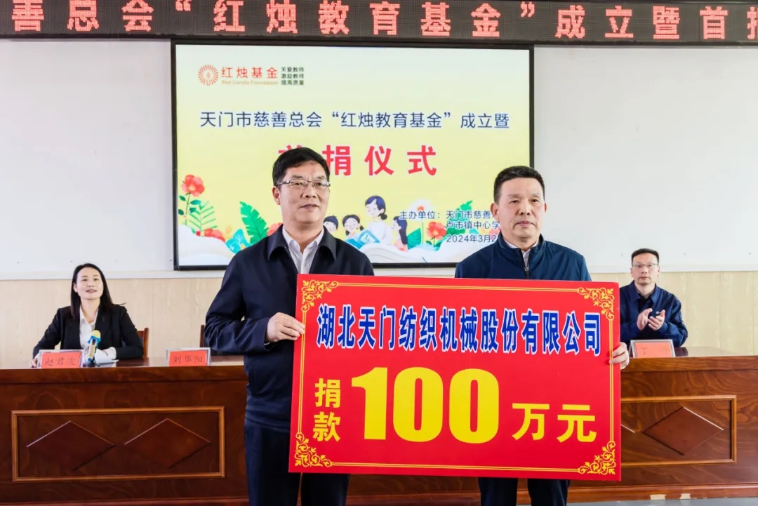 2024年3月21日,天門紡機(jī)董事長(zhǎng)沈方勇出席在天門市盧市鎮(zhèn)盧家口中學(xué)舉行的天門慈善總會(huì)“紅燭教育基金”成立暨首捐儀式,同天門市慈善總會(huì)、教育局三方簽訂了《天門市慈善總會(huì)“紅燭教育基金”協(xié)議書》,并現(xiàn)場(chǎng)捐贈(zèng)100萬元,用于獎(jiǎng)勵(lì)盧市鎮(zhèn)優(yōu)秀教師和幫扶困難教師等公益活動(dòng),助力盧市鎮(zhèn)教育高質(zhì)量發(fā)展。天門市人民政府副市長(zhǎng)古玉麗,天門市民政局局長(zhǎng)、市慈善總會(huì)會(huì)長(zhǎng)謝金才,天門市教育局局長(zhǎng)劉華陽,天門市慈善總會(huì)秘書長(zhǎng)李貴清,盧市鎮(zhèn)宣傳統(tǒng)戰(zhàn)委員劉恒超以及盧市鎮(zhèn)部分教師代表等參加首捐儀式。盧市鎮(zhèn)黨委書記趙君波主持儀式。