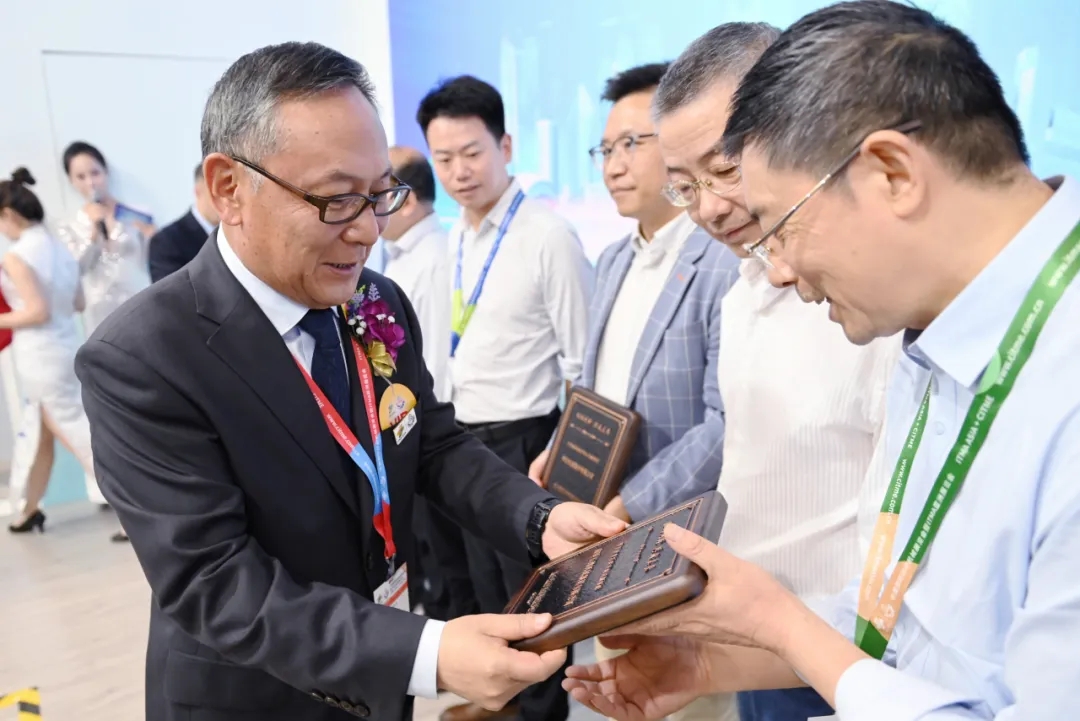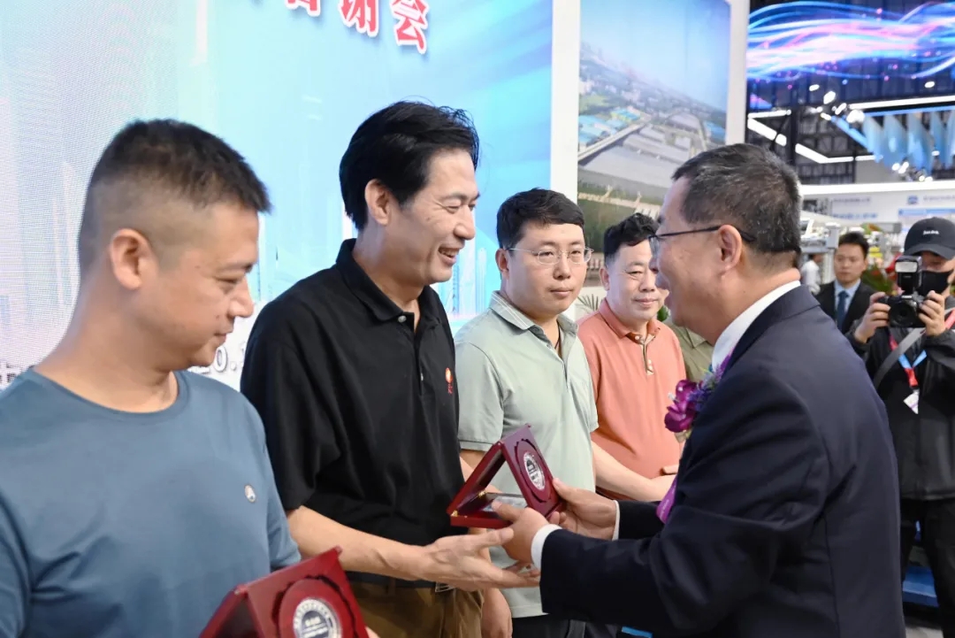 天門紡機(jī)副總經(jīng)理肖少華宣布為在并條新技術(shù)、新產(chǎn)品示范應(yīng)用上作出突出貢獻(xiàn)的華茂集團(tuán)、魏橋紡織、魯泰紡織等45家企業(yè)名單,中國棉紡織行業(yè)協(xié)會(huì)董奎勇會(huì)長(zhǎng)為這些企業(yè)代表頒發(fā)紀(jì)念牌。