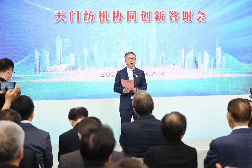 中國紡織工業(yè)聯(lián)合會(huì)會(huì)長(zhǎng)孫瑞哲作了重要講話。他首先代表中國紡織工業(yè)聯(lián)合會(huì)對(duì)活動(dòng)的舉辦表示熱烈祝賀!向?yàn)樘扉T紡機(jī)并條技術(shù)進(jìn)步作出貢獻(xiàn)的功臣們致以崇高敬意!他在給予天門紡機(jī)“是當(dāng)之無愧的棉紡并條專家”的充分肯定與最高贊譽(yù)時(shí)強(qiáng)調(diào):作為紡機(jī)行業(yè)的中堅(jiān)力量,天門紡機(jī)扎根本土、布局全球、銳意創(chuàng)新、深耕專業(yè),在推動(dòng)民族紡機(jī)品牌自立自強(qiáng)中貢獻(xiàn)卓著。天門紡機(jī)的每一次成功與飛躍,是企業(yè)自身追求卓越、勇攀高峰的回報(bào),也是產(chǎn)業(yè)生態(tài)高效協(xié)同、價(jià)值共創(chuàng)的成果。他希望:在新征程上,天門紡機(jī)及其合作伙伴繼往開來、攜手共進(jìn)、一以貫之推進(jìn)紡機(jī)行業(yè)行穩(wěn)致遠(yuǎn),助力中國紡織行業(yè)新質(zhì)生產(chǎn)力發(fā)展。