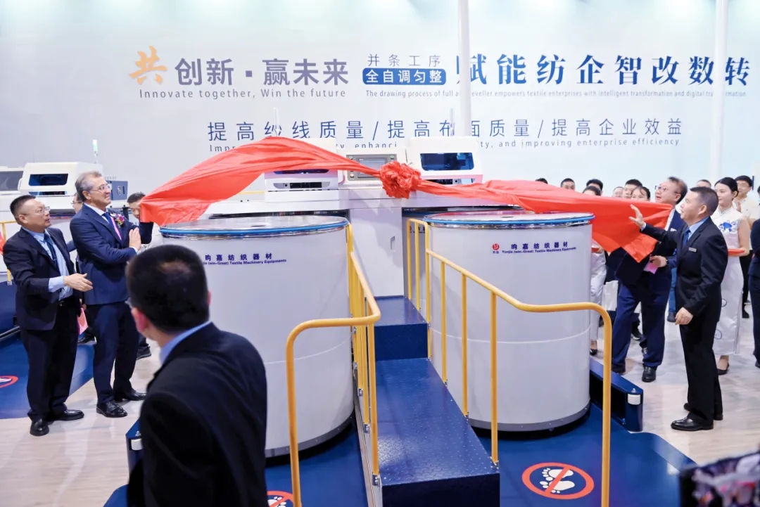 答謝會(huì)結(jié)束后,隨即舉行了新產(chǎn)品揭幕、開機(jī)儀式。天門紡機(jī)今年展出了TM23、TM27H、TM29H、TM35等四款型號(hào)的并條機(jī)。中國紡織工業(yè)聯(lián)合會(huì)孫瑞哲會(huì)長(zhǎng)等行業(yè)領(lǐng)導(dǎo)、嘉賓一起為新產(chǎn)品揭幕,孫會(huì)長(zhǎng)為展機(jī)啟動(dòng)開機(jī)。