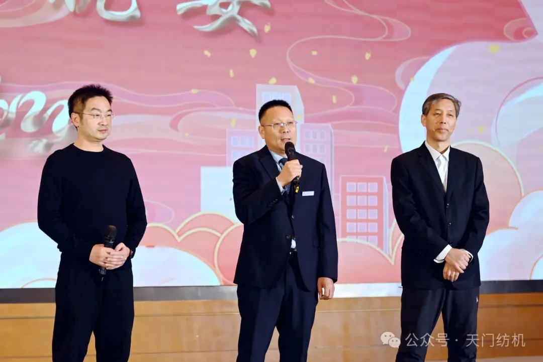 雙清智能總經理蔡文超(左)、天門紡機副總經理肖少華(中)、紗線網常務副總裁孫其海(右)為晚宴致辭