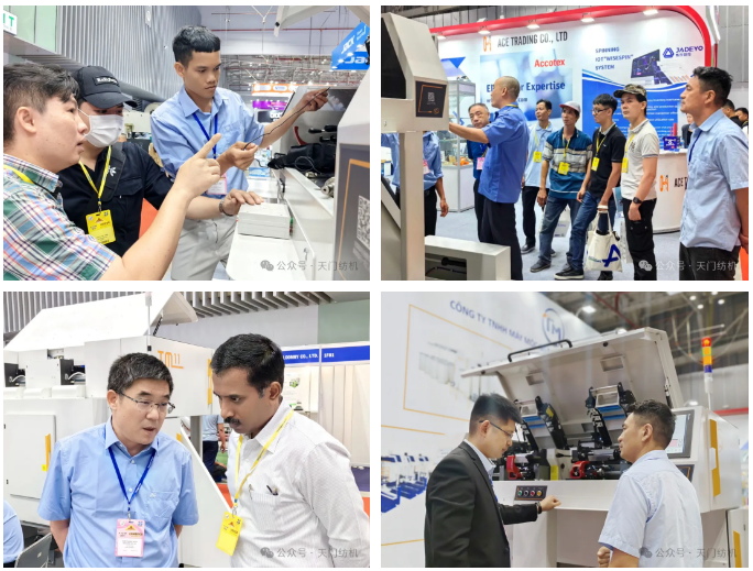 越南展會現場人流如織,其中天門紡機展區(qū)尤為矚目,開展期間分別迎來HANO SIMEX、VICOTEX、HONG LINH、NHA TRANG、THANG CONG、PHU BAI等50余家越南紡企的到訪,T1系列并條機憑借卓越性能表現,引發(fā)現場觀眾駐足,多位老客戶對T1系列并條機的穩(wěn)定性與高效產能給予高度評價。