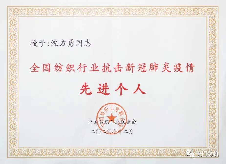 董事長代表公司獲評“2019中國紡織行業(yè)年度創(chuàng)新人物”。TM3817S型并條機獲評“紡織之光”2020年度中國紡織工業(yè)聯(lián)合會“科技成果優(yōu)秀獎”。鄭強、楊家軒、黃必廣、郭升旗、徐紅、譚鵬飛、沈忱等7名研發(fā)人員獲得個人“科技成果優(yōu)秀獎”。